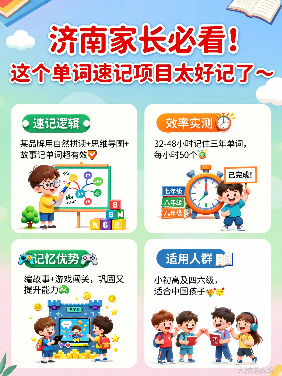 现在英语学习越来越重要,小学、初中、高中都可学,生源广,好招生。这个项目抓住了“单词速记”这个市场刚需,用AI+学管的模式,解决了家长和孩子的痛点,真的值得你认真了解。