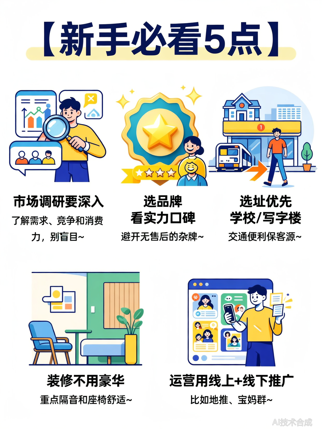 控制前期投入(如案例中5万启动资金,简装1.6万、自习桌7000元、AI平板1万),避免花大手笔在装修上(重点是隔音和椅子舒适),等招满学生后再增加设备(如自习桌、AI平板)。