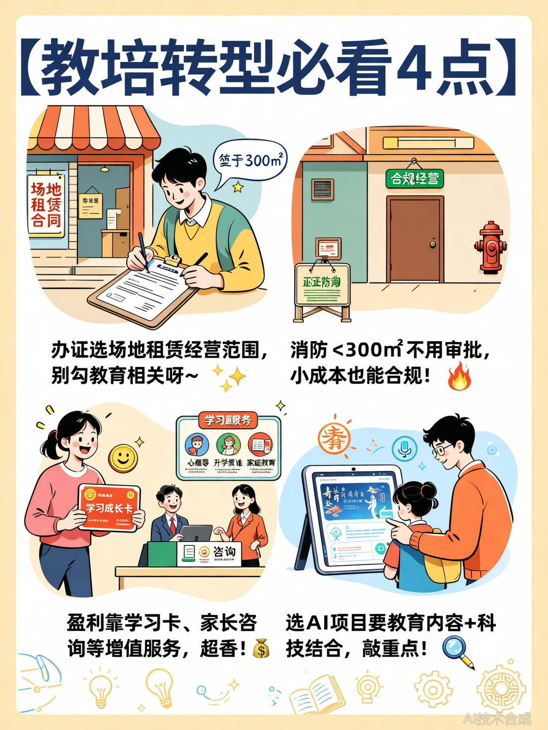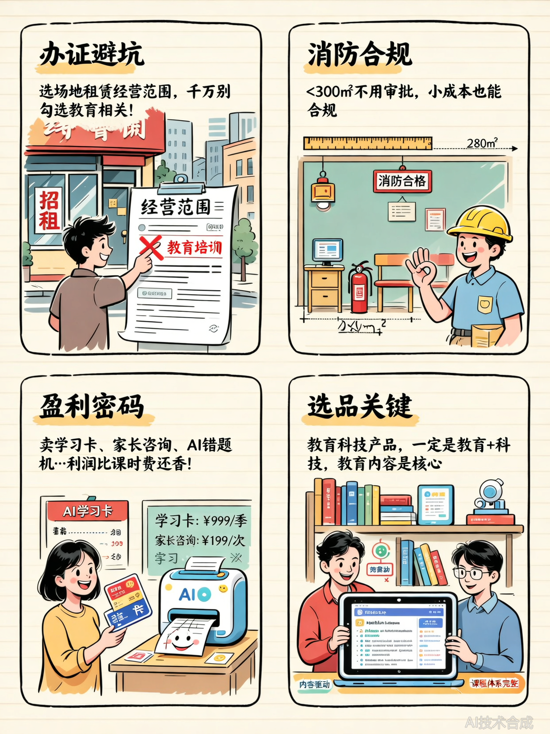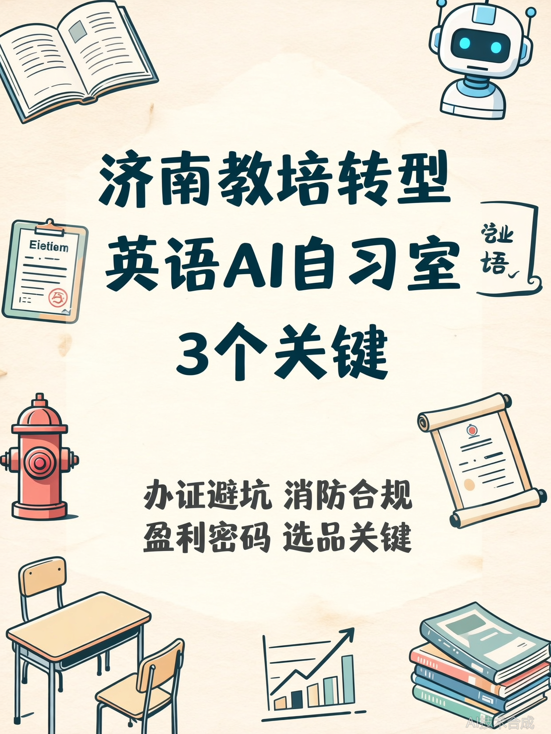 济南教培机构转型英语AI自习室,第一步最容易踩什么坑?好多人栽在办证和消防上。✅ 第一步:办证别踩坑 选“场地租赁”经营范围,千万别勾选教育相关!✅ 第二步:消防卡300平 <300㎡不用审批,小成本也能合规(自习室可以搜索当地消防政策表)✅ 第三步:盈利靠增值服务 卖学习卡、家长咨询、AI错题机…利润比课时费还香!我当年第一次办证,差点选了教育相关,幸亏前辈提醒,不然现在还在整改。