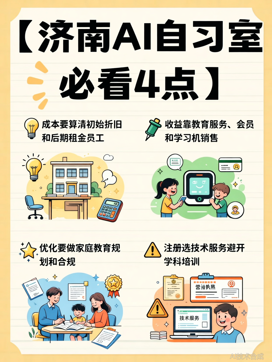 要想做好AI自习室,得避开“只卖机器”的误区,抓住这几个关键。①全面的家庭教育规划:只卖机器和座位的自习室门槛低,但竞争激烈。提供全面的家庭教育规划、高质量的督学服务以及后端的研学服务,才能吸引更多家长和学生。②AI学习机+伴学模式:AI自习室的核心是提升孩子的学习效率和学习成绩。学习机是否具备个性化学习方案和教育逻辑体系,是考察的关键。③合规经营:打擦边球、挂羊头卖狗肉的行为迟早会被淘汰。选择有实力的加盟品牌,确保合规经营,才能长久发展。